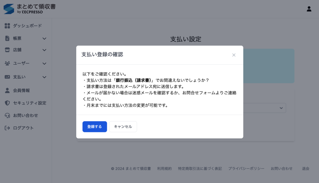 確認のモーダルが表示されますので、支払い方法と注意書きをご確認の上「登録する」をクリックします。