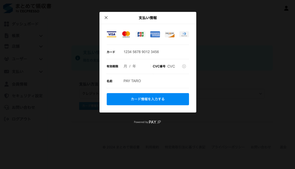 支払い情報の入力フォームが表示されますので、【カード番号】【有効期限】【CVC番号】【名前】を入力して「カード情報を入力する」をクリックします。
