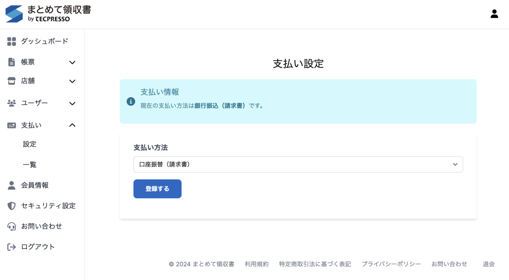 プルダウンメニューで「銀行振込」または「口座振替」を選択した場合、「登録する」をクリックします。