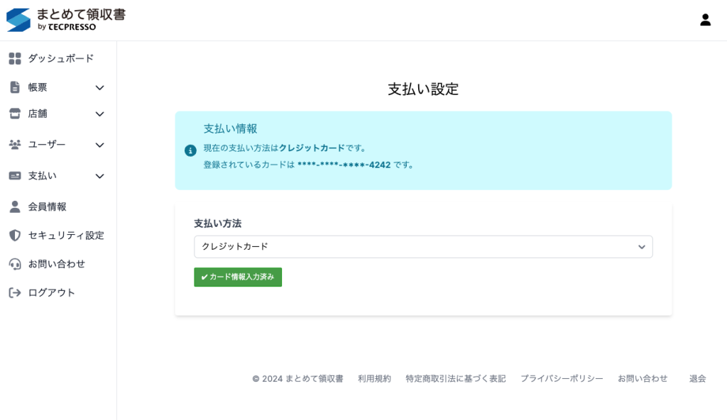 カードの登録が完了すると、ページ上部の支払い情報欄に現在のお支払い方法と登録されているカードの下4桁が表示されます。