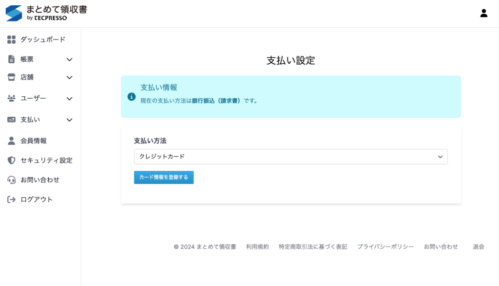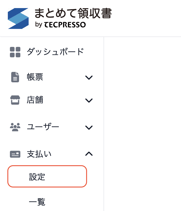 まず、ナビゲーションメニューから「支払い>設定」をクリックします。
