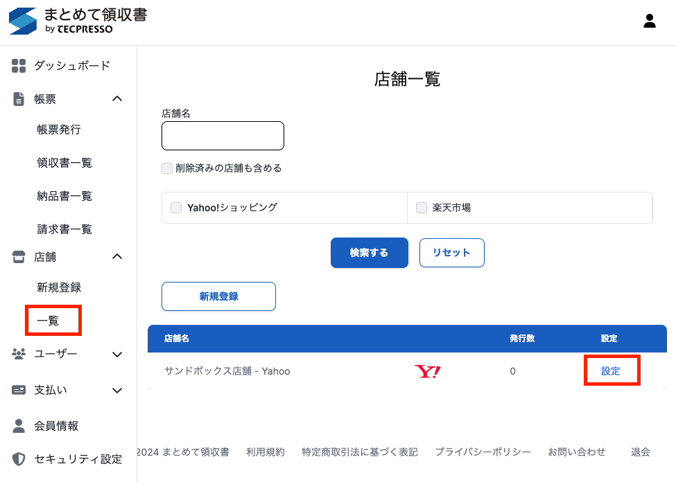 ナビゲーションメニューから「店舗 > 一覧」を開き、対象店舗の「設定」を押します。