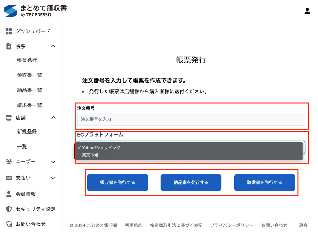 「注文番号」と「ECプラットフォーム」を入力し、発行する帳票に合わせた発行ボタンを押します。