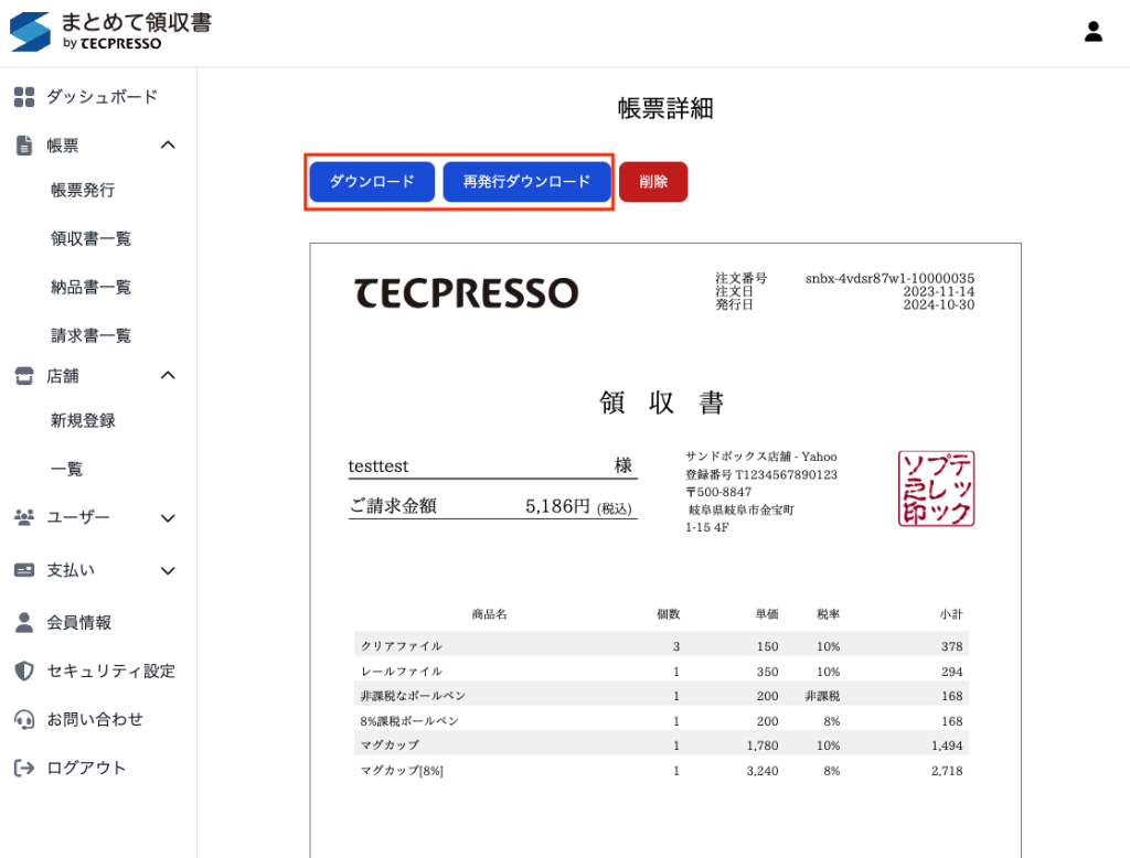 内容に間違いがなければ、領収書のプレビュー画面の上にある「ダウンロード」・「再発行ダウンロード」のうちどちらかを押してダウンロードします。