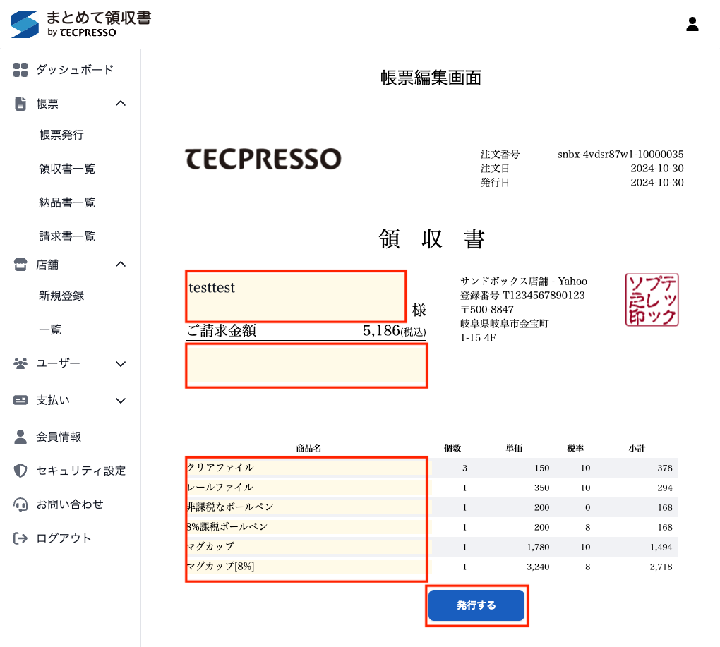 1.「宛名」と「備考」、「商品名」を必要に応じて編集し、右下の「発行する」ボタンを押します。