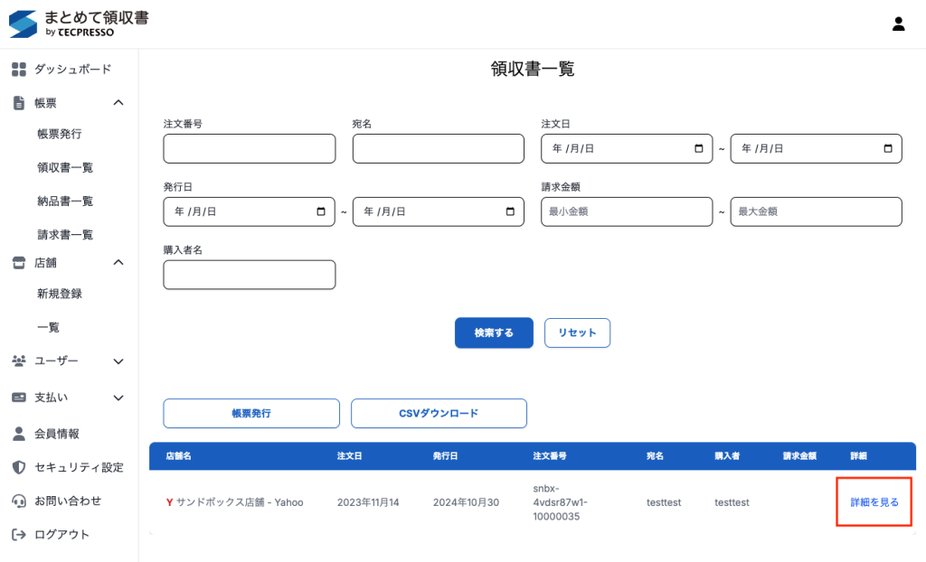 今まで発行された領収書が一覧になっていますので、削除したい領収書を検索し「詳細を見る」を押します。
