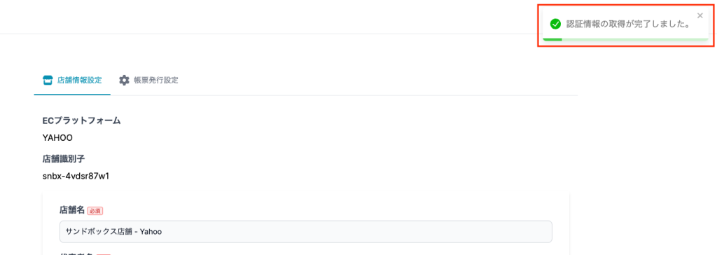 - リダイレクト後、画面上部に緑色のバナー「認証情報の取得が完了しました。」が表示されていたら完了です。