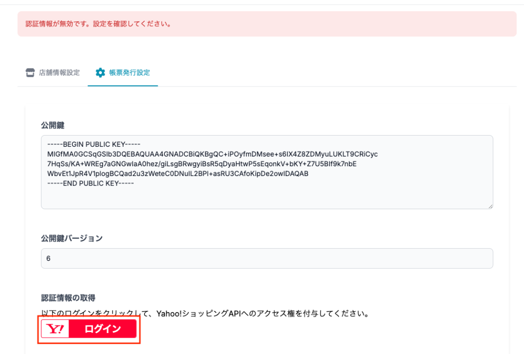 認可期間を過ぎた場合、領収書を発行する際に「Yahoo!ショッピングAPIの認証に失敗しました。認証情報の取得(Y!ログイン)からやり直してください。」や「認証情報が無効です。設定を確認してください。」とエラーが表示されるので、認証情報の取得をして下さい。
