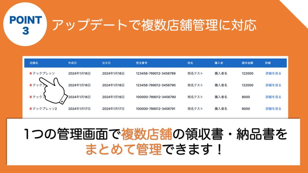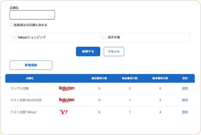 1つの管理画面で複数店舗の領収書・納品書・請求書をまとめて管理できます。楽天市場・Yahoo!ショッピングなど異なるECプラットフォームにまたがった店舗も一括管理できるようになりました。