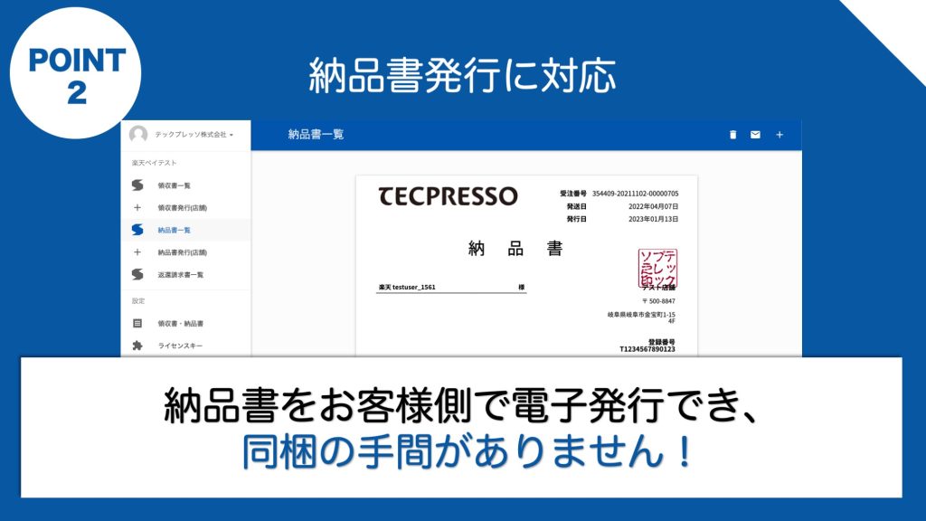 | 納品書(お買い上げ明細書) | 印刷して発送時に同梱 このひと手間が発送作業の負担に 贈答用の注文には同梱しないなどの対応分けが必要 | お客様がダウンロード 同梱の手間がありません ギフトと自宅用で対応を分ける必要もありません |